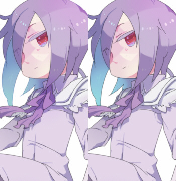 つい赤で塗ってしまいましたが、思い返したらツーの目は紫だったのでここで色変更。 目の部分だけ選択、フィルタで色相変更します。 複数のレイヤーに一度にフィルターをかけたい場合は目のアイコンの下をチェックするとよかです。 |