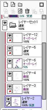 このままだと全体的に薄い印象なので、オーバーレイで色合いや明度の調整。 着色したレイヤーはレイヤーセットでまとめてるので、 その上にオーバーレイを敷いてバケツ塗り→[下のレイヤーでクリッピング]。 より効果的な色を探します。 |